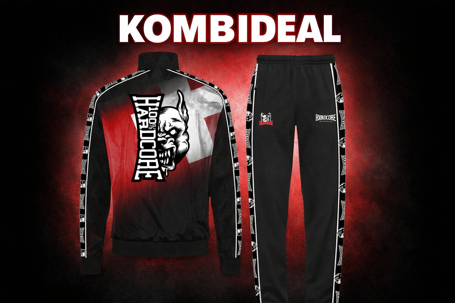 Veste d'entraînement Swiss Hardcore &100 % Hardcore Duo de haute qualité, avec pantalon d'entraînement, dans un emballage spécial avec passepoil