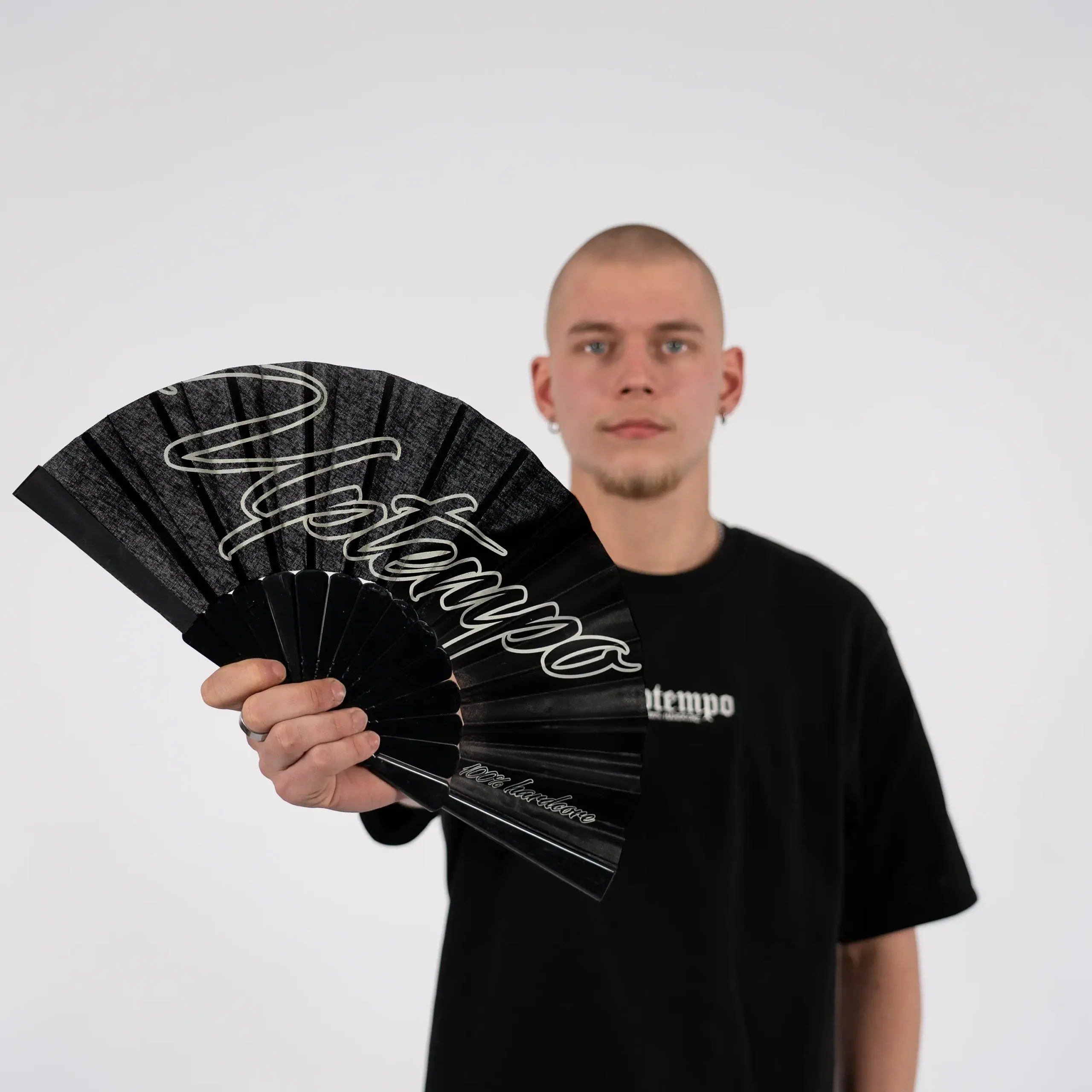 Restez au frais avec cet élégant éventail noir Uptempo, qui arbore des inscriptions accrocheuses et bénéficie d'une conception robuste et pliable. Parfait pour les festivals et les fêtes.