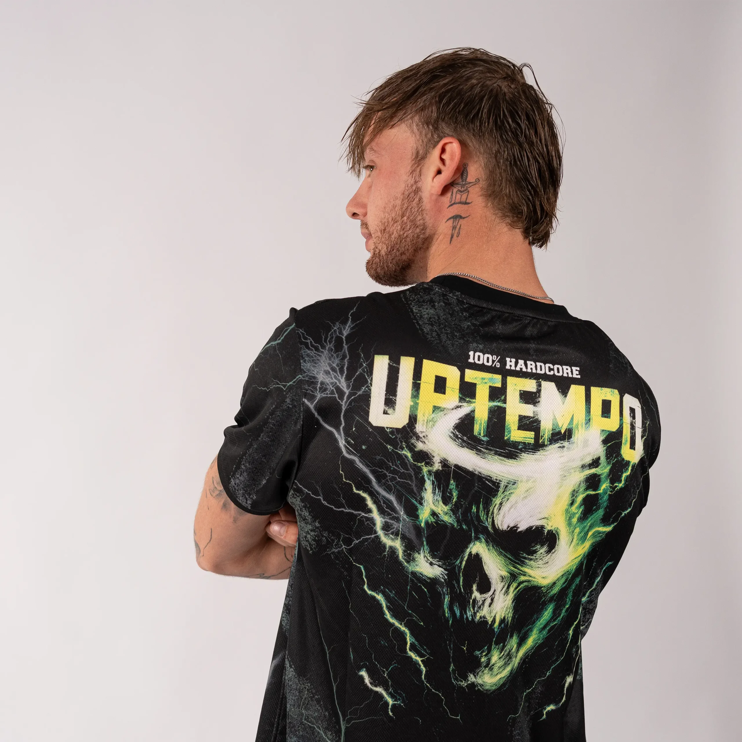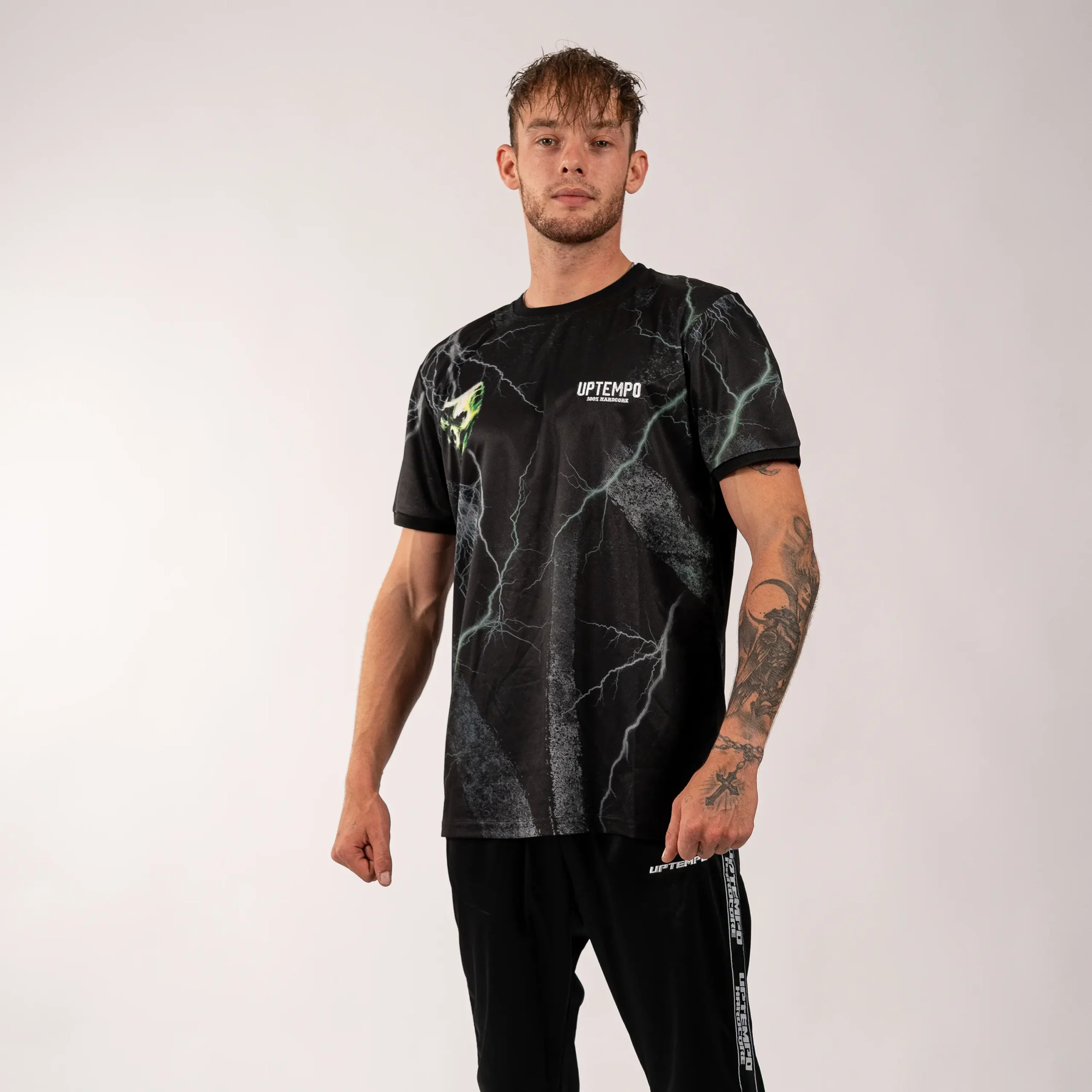 Le maillot de football "Uptempo Skullstorm" allie le confort à un design continu et énergique. Fabriqué dans un matériau léger et respirant, il présente des effets d'éclairs frappants sur l'ensemble du maillot, un logo Uptempo puissant sur le devant et un graphisme de tête de mort chargé d'éclairs accrocheur dans le dos. Une véritable pièce de déclaration pour tout fan d'Uptempo.