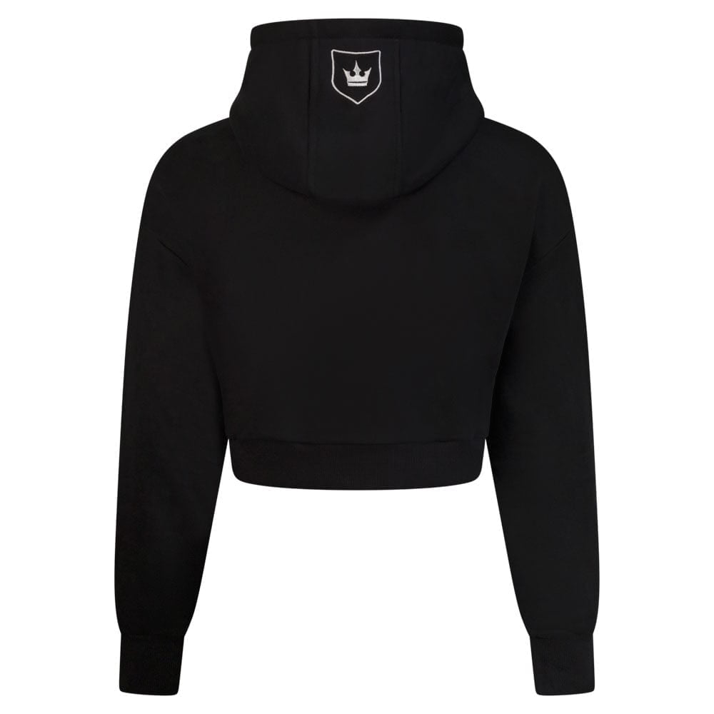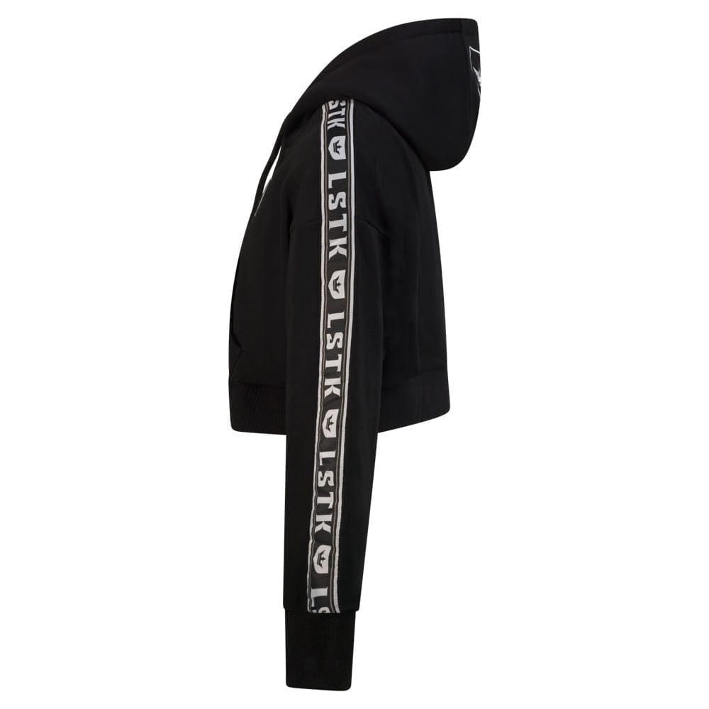 Schwarzer LSTK-Kapuzenpullover mit kurzem Schnitt. LSTK-Logo auf der Vorderseite gestickt.